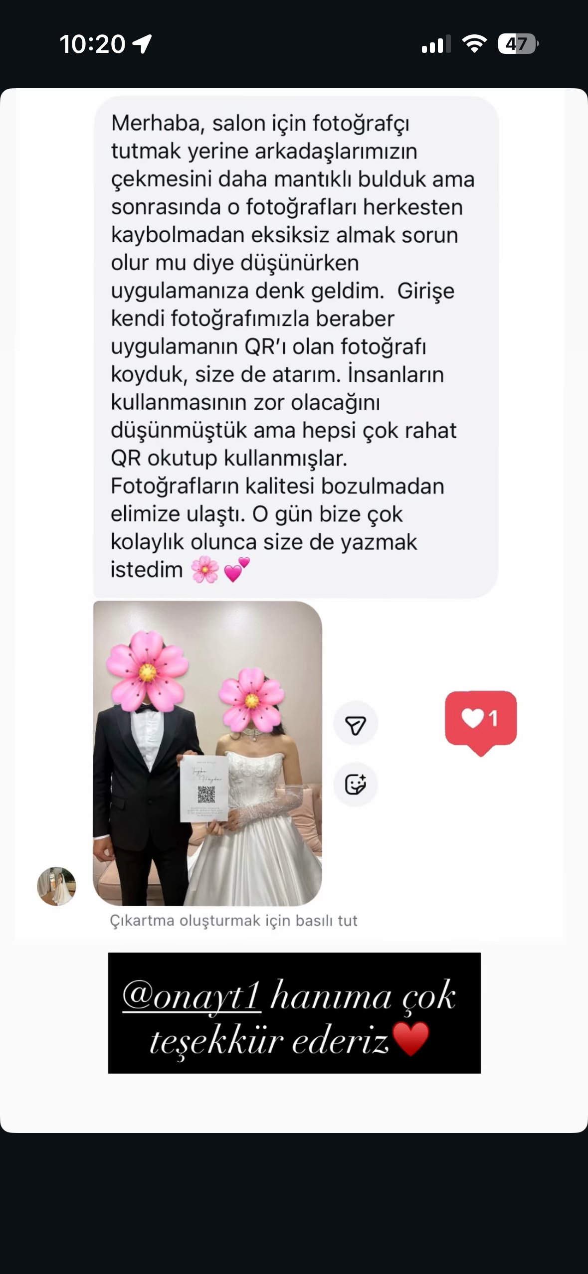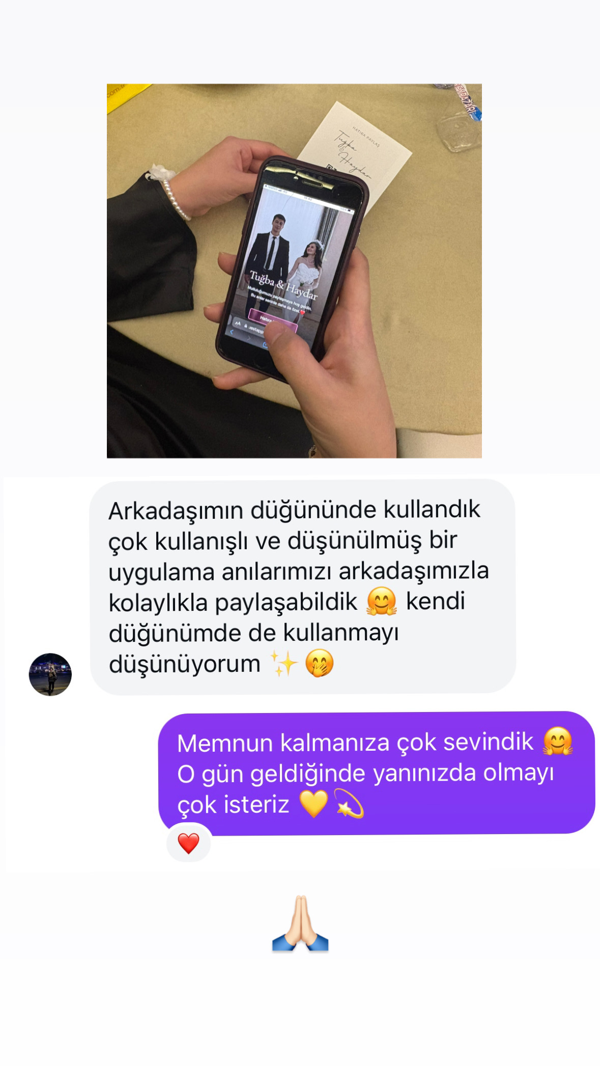 “Düğünümüzde 300 kişiydik ve herkes rahatça fotoğraf paylaştı. WhatsApp'ta kaybolup giden fotoğraflar yerine, tüm anılarımız bir yerde, kaliteli şekilde toplandı.”