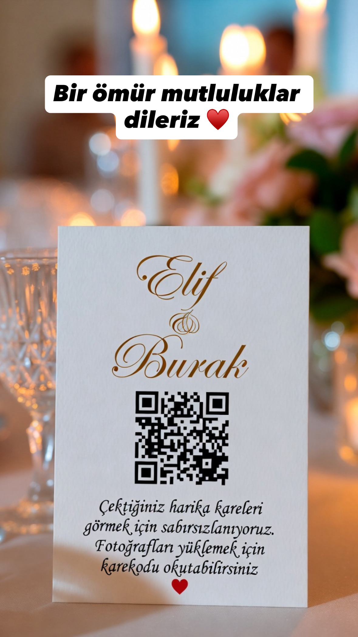 Masalara, davetiyelere, posterlerinize yerleştirin. Misafirler uygulama indirmeden, yalnızca kamerayla okutarak fotoğraflarını anında yükler.